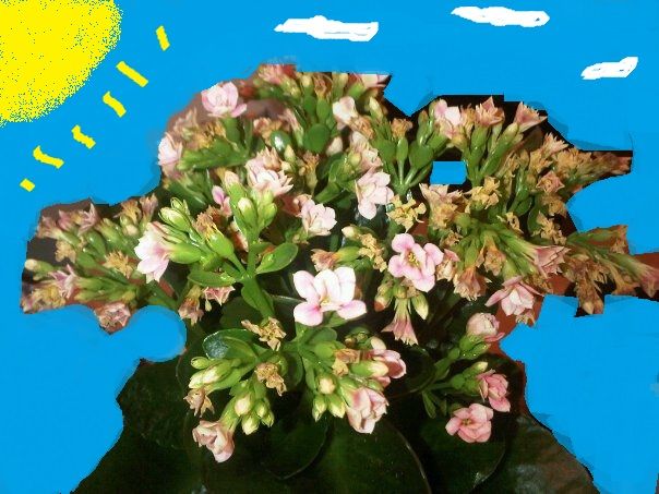 1. doordat ik er een rustgevende achtergrond ( Blauw ) erin heb gedaan valt de onrust van de bloemen weg en door de zon met zijn fele gele kleer lijd je een beetje af van de doeie bloempjes